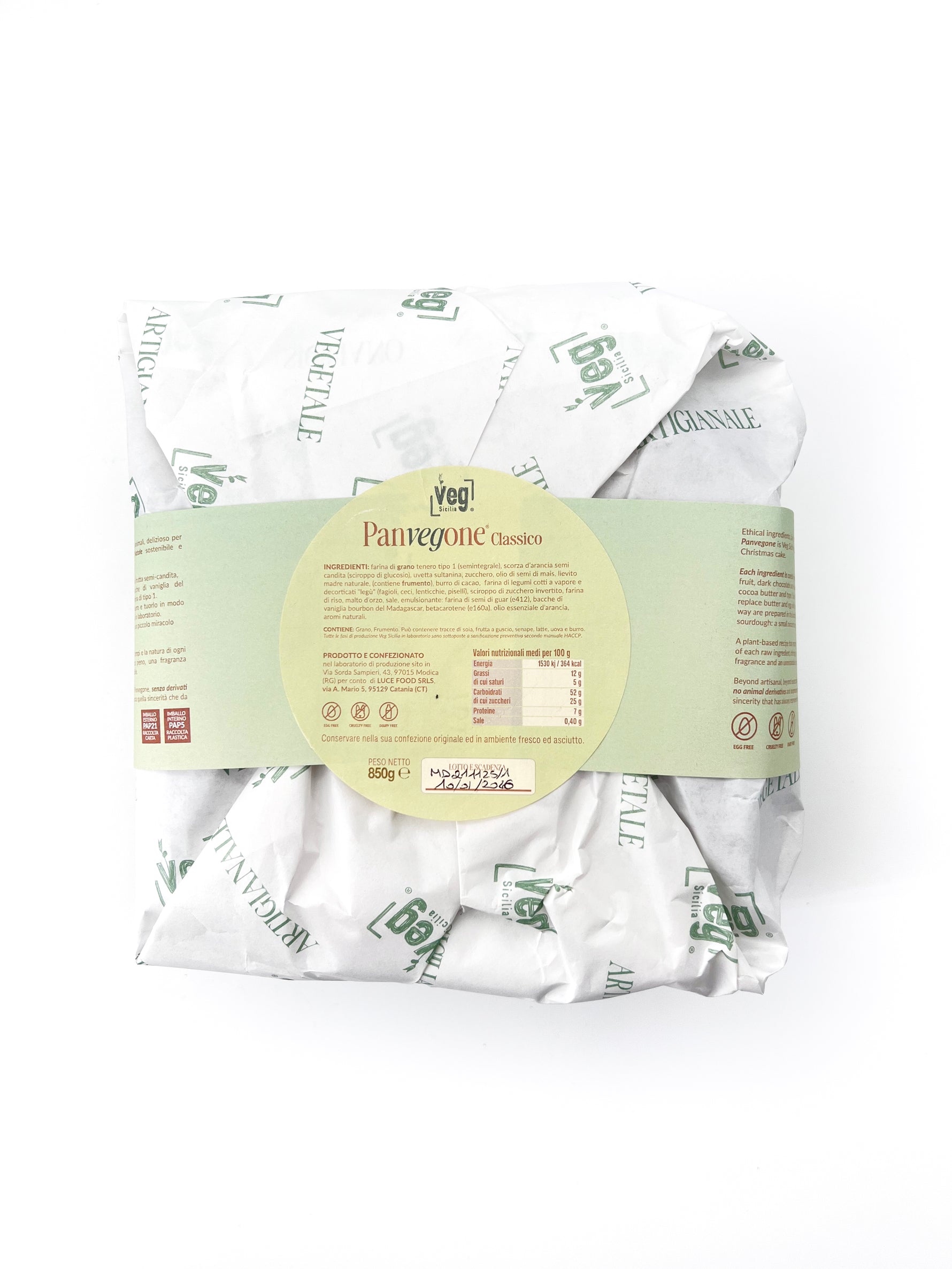 • A 700 gr artisanal panettone: soft and genuine, with candied orange peels and our Pizzuta di Avola almonds. VegSicilia’s PanVegone is 100% plant-based, suitable for those intolerant to milk and eggs or following a vegan/vegetarian diet.